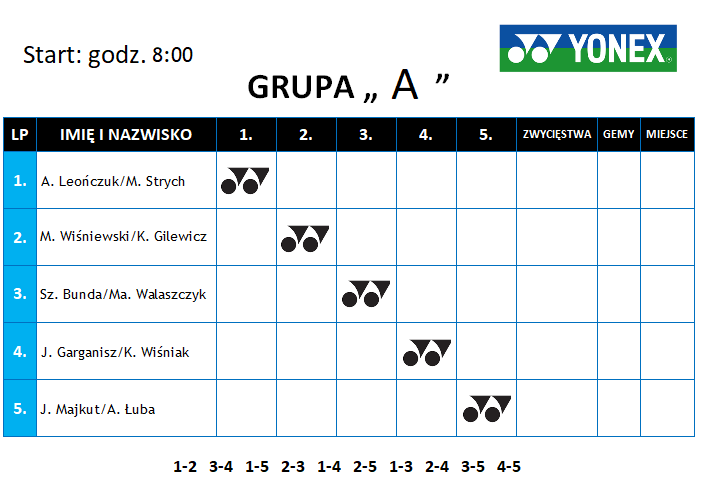 Dziś odbyło się losowanie do sobotniego turnieju Yonex Demo Days Cup. Do turnieju przystąpi 20 zawodników, którzy drogą losowania utworzyli 10 par. Pary zostały podzielone na dwie grupy, w których rozgrywamy mecze systemem “każdy z każdym” do dwóch wygranych super tie break’ów, trzeci ewentualny set tie break’owy do 7 pkt. Pod tabelkami znajduje się kolejność gier. Do półfinałów awansują dwie najlepsze pary z obu grup. Powodzenia 🙂